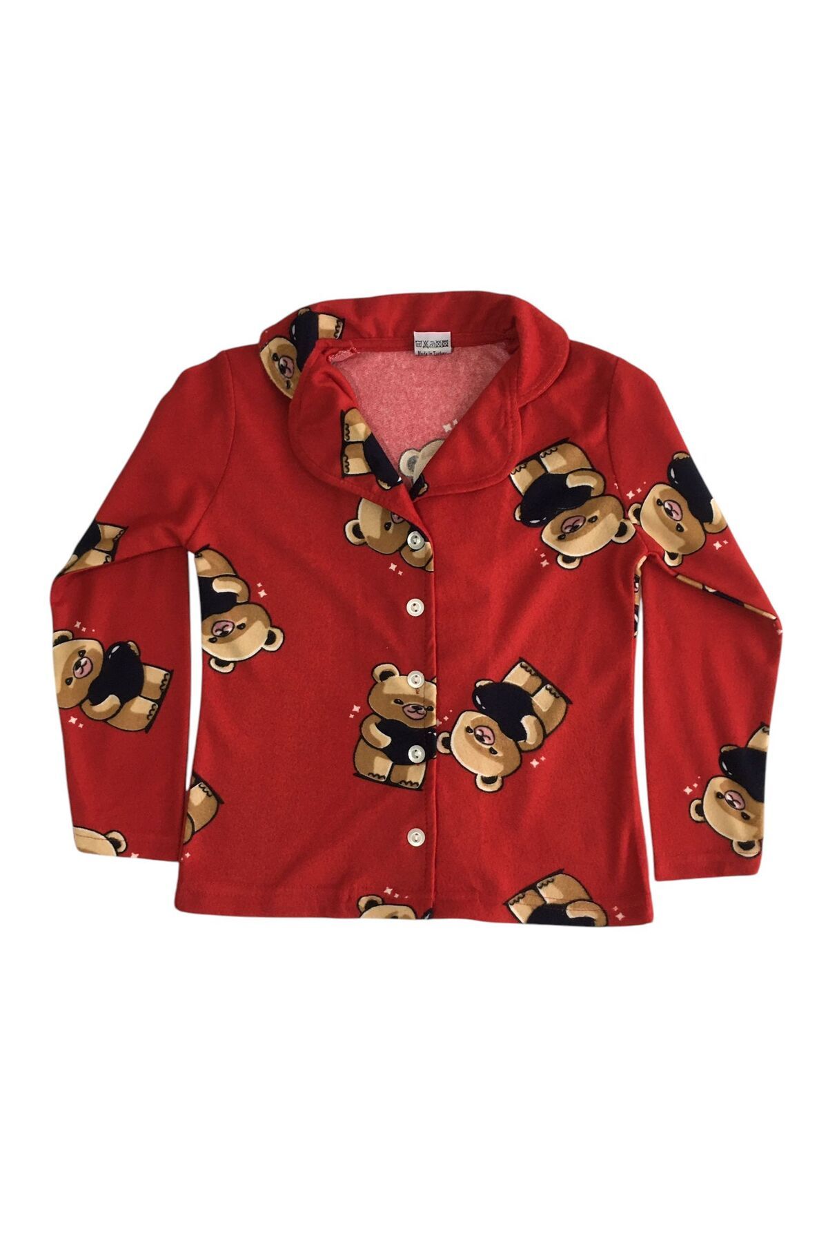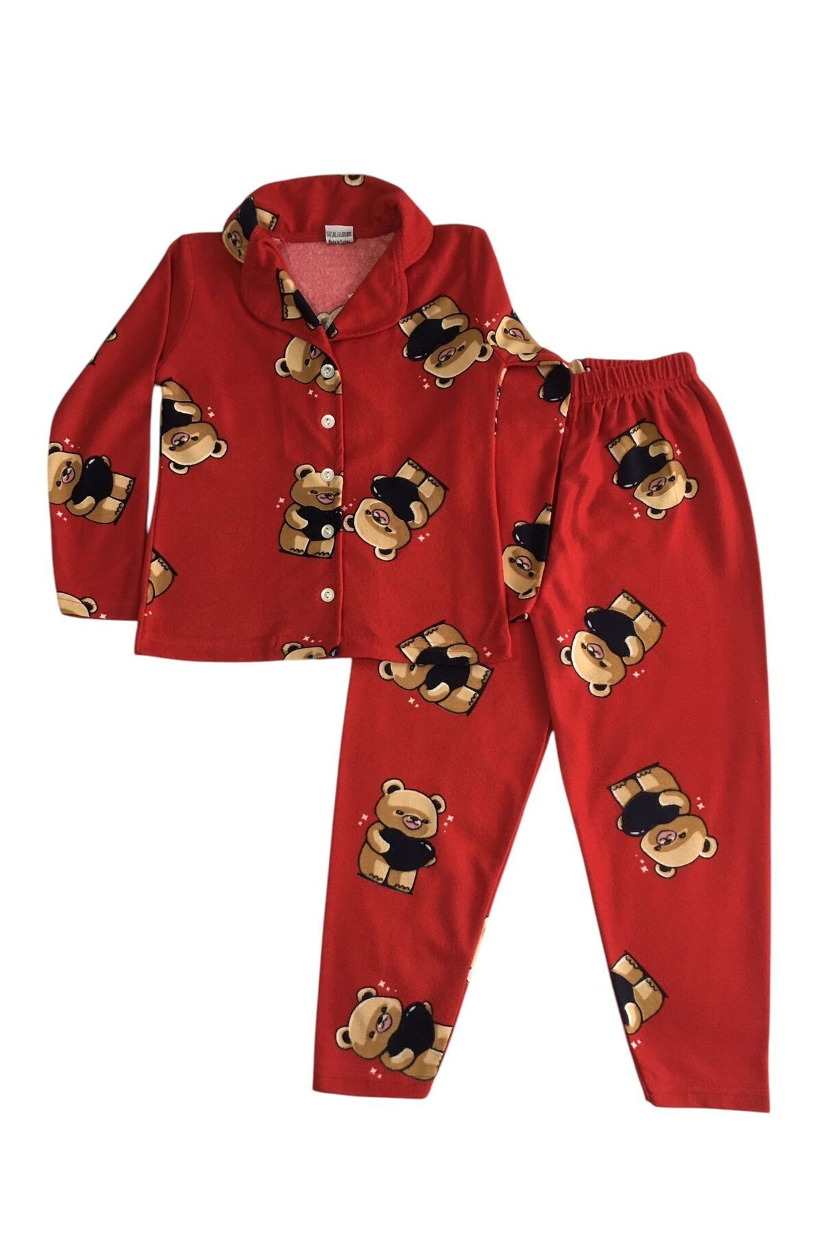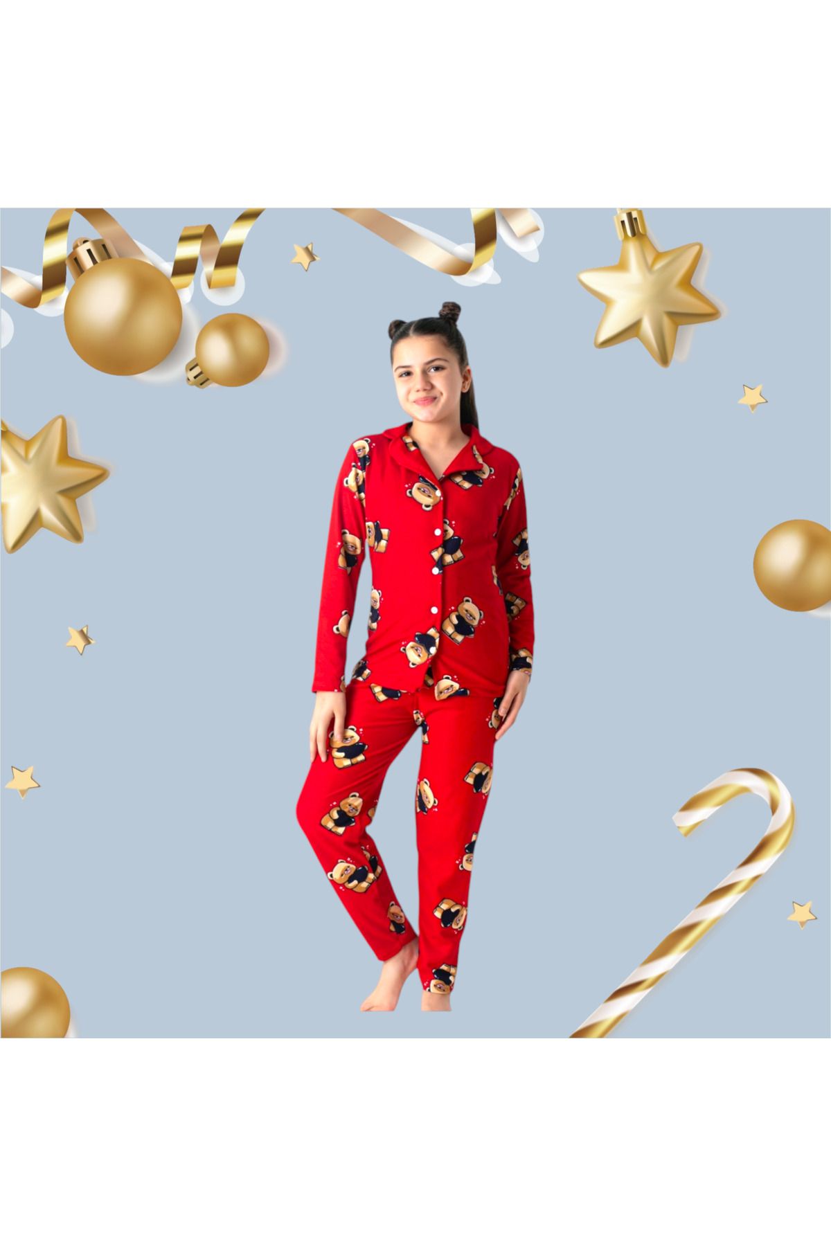 – Şirin ayıcıklarla süslenmiş, çocukların seveceği kırmızı desenlere sahip.; – Pratik kullanım sunan önden düğmeli tasarımıyla kolay giyilip çıkarılabilir.; – Rahat hareket etme imkanı sağlayan normal bel kesimi ile konforlu bir uyku deneyimi sağlar.; – Boru paça pantolon tipi sayesinde şıklığı ve rahatlığı aynı anda yaşatır.; – Bisiklet yakası ile modern ve zamansız bir görünüm kazandırırken, günlük kullanım için idealdir.; – İki parçadan oluşan set içeriği; hem üst hem de alt parça olarak tamamlanan kombiniyle bütünlük sunar.; – Orta kalınlığa sahip kumaşı mevsim geçişlerinde ideal sıcaklık dengesi sağlar.; – Özel günlerde tercih edebileceğiniz yılbaşı temalı baskısıyla fark yaratmanızda yardımcı olur.; – Normal siluet yapısına sahip bu pijama takımı her vücut tipine uyum göstererek rahat bir oturuşa izin verir.; -Süet dokumasının yumuşak hissiyatını cildinizle buluşturarak üstün konfor vaadederken dayanıklılığı da arttırır